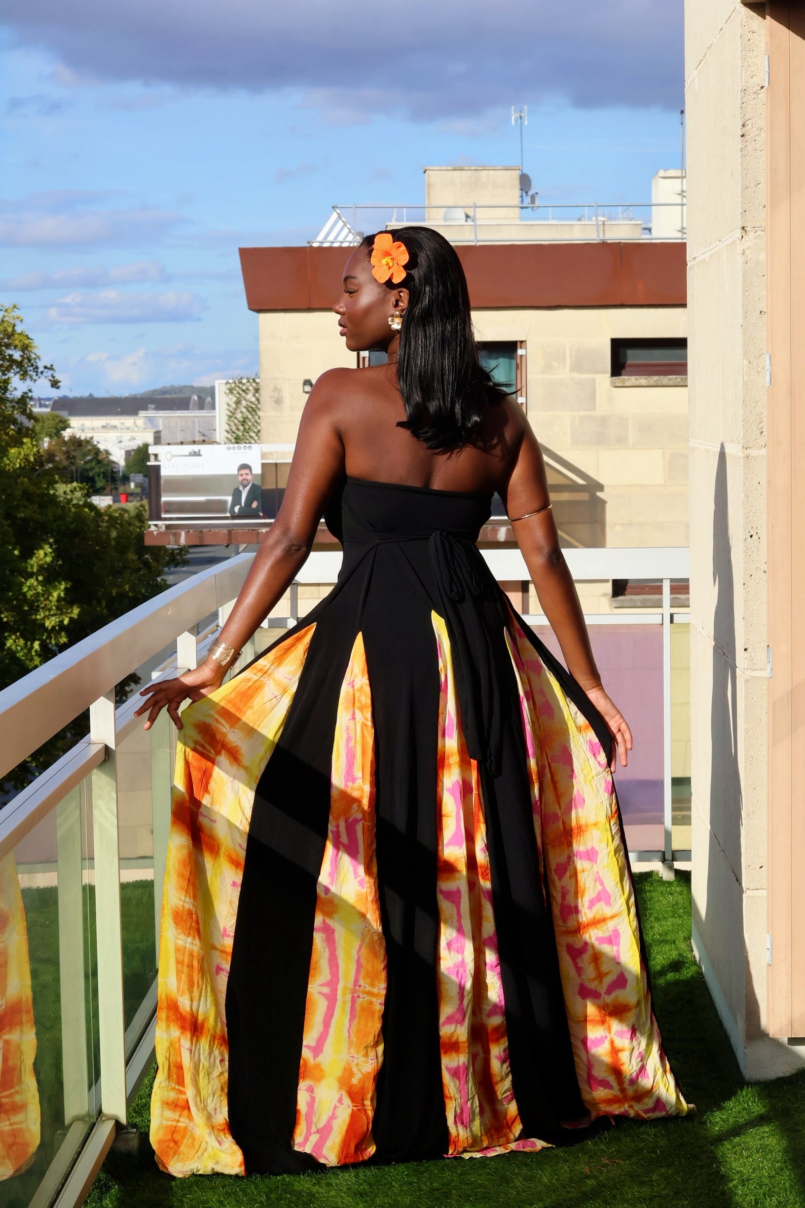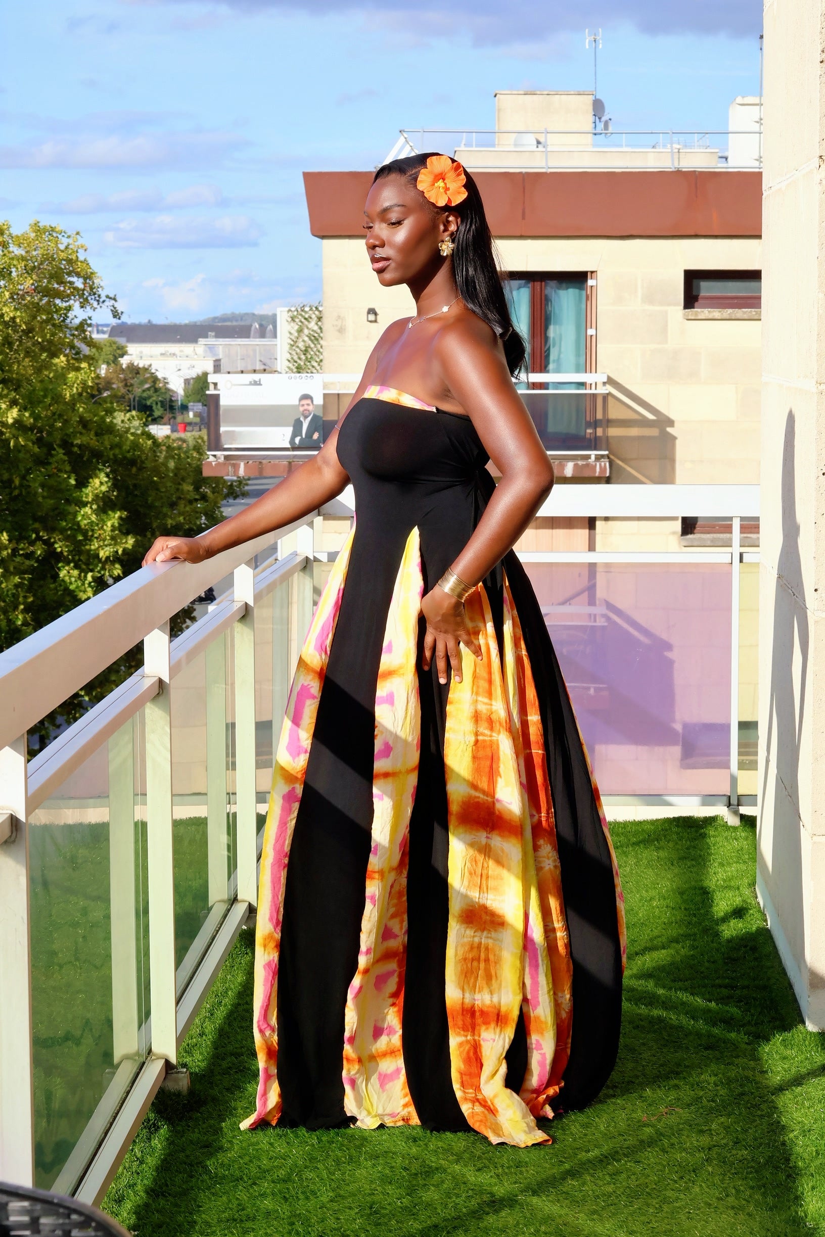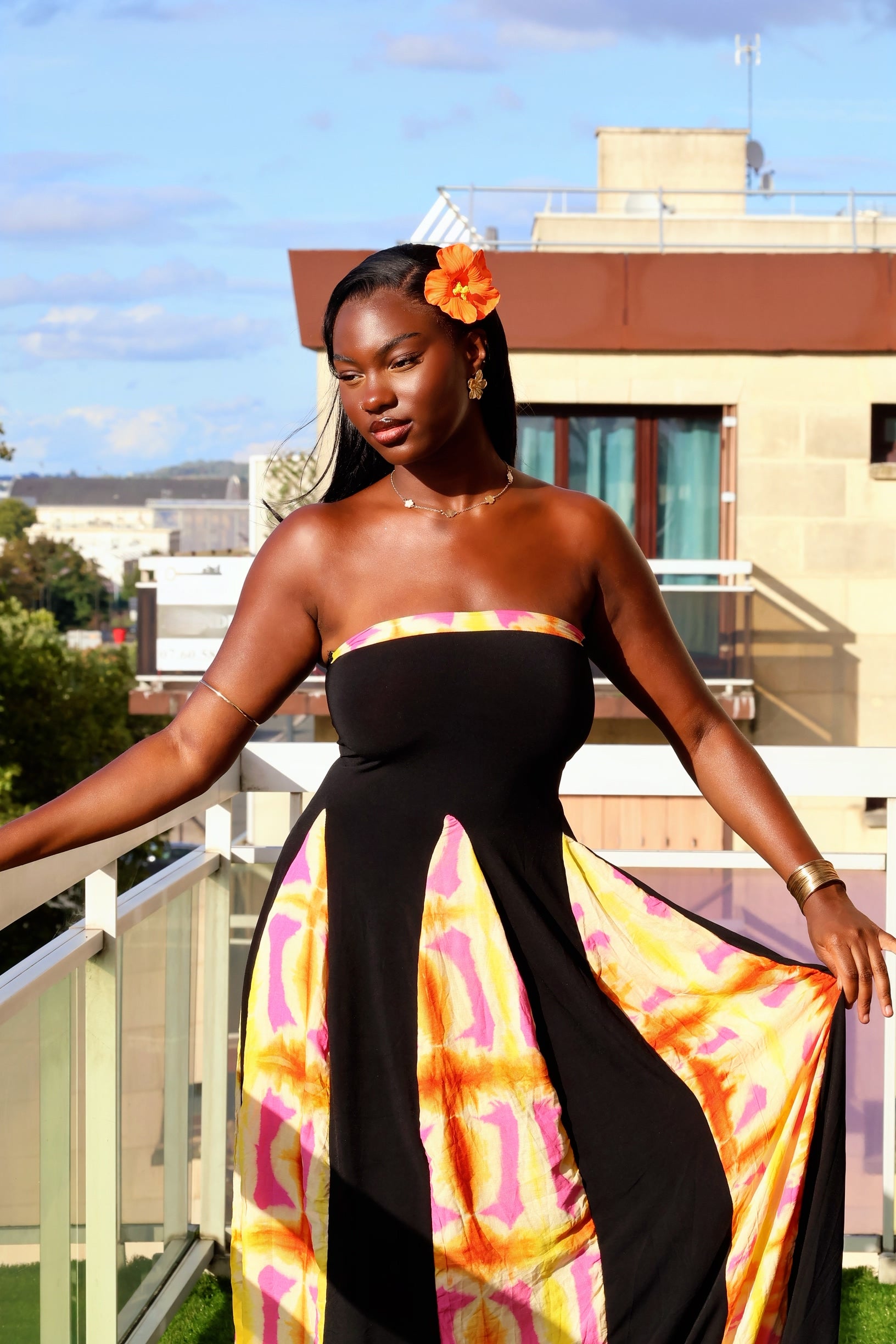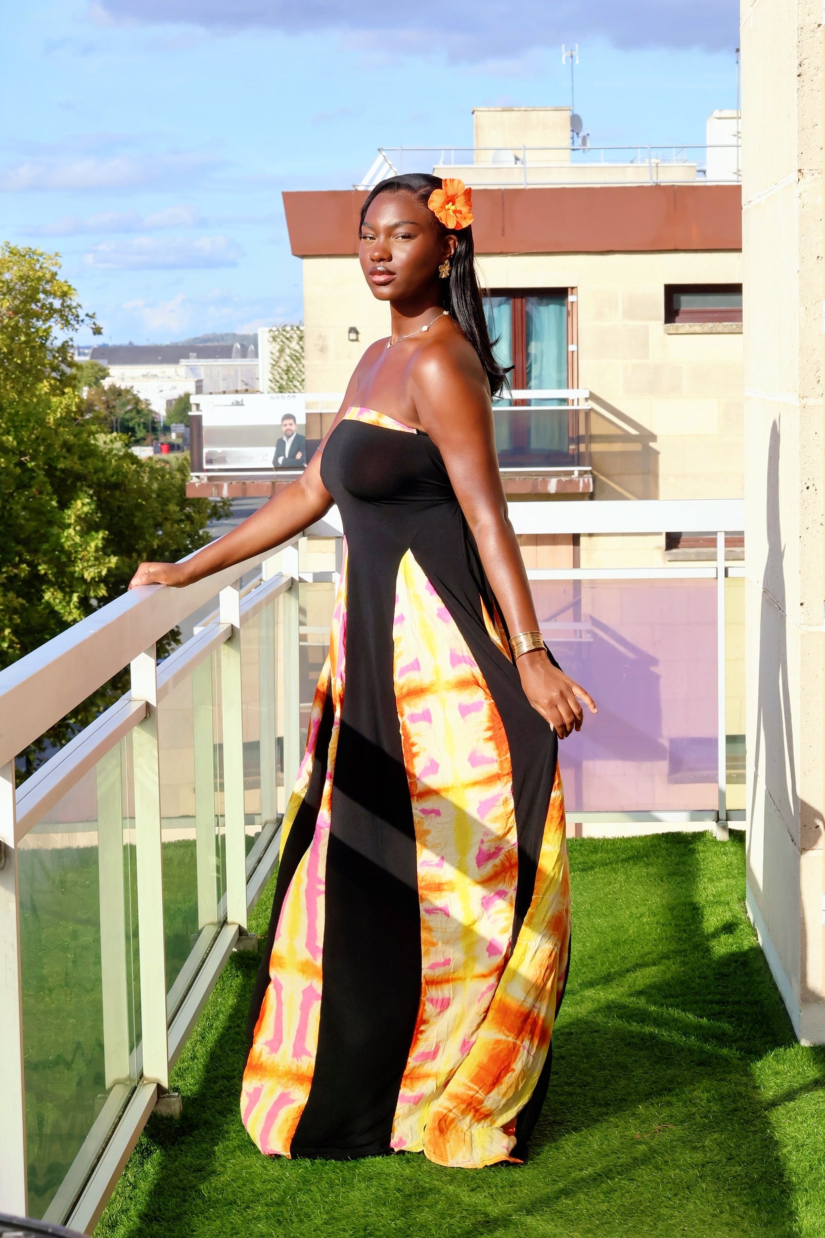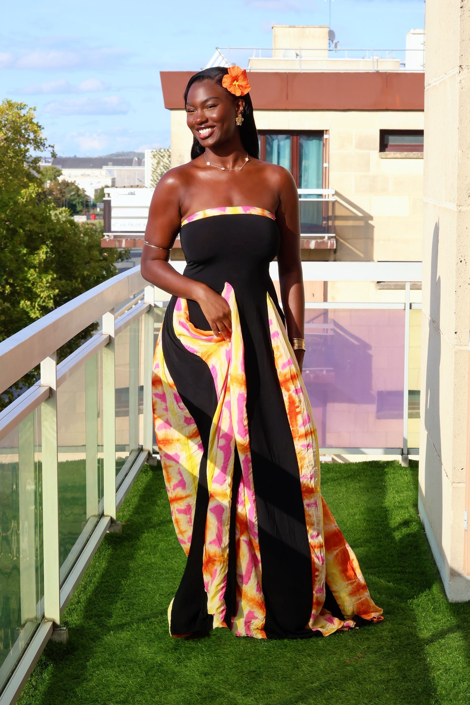 Cette robe bustier en dempé, née de l’artisanat mauritanien, reflète la noblesse d’un tissu au prestige ancestral. Son noir profond incarne la force et la dignité, tandis que ses éclats roses, jaunes et orangés rappellent les couleurs d’un ciel saharien au coucher du soleil.